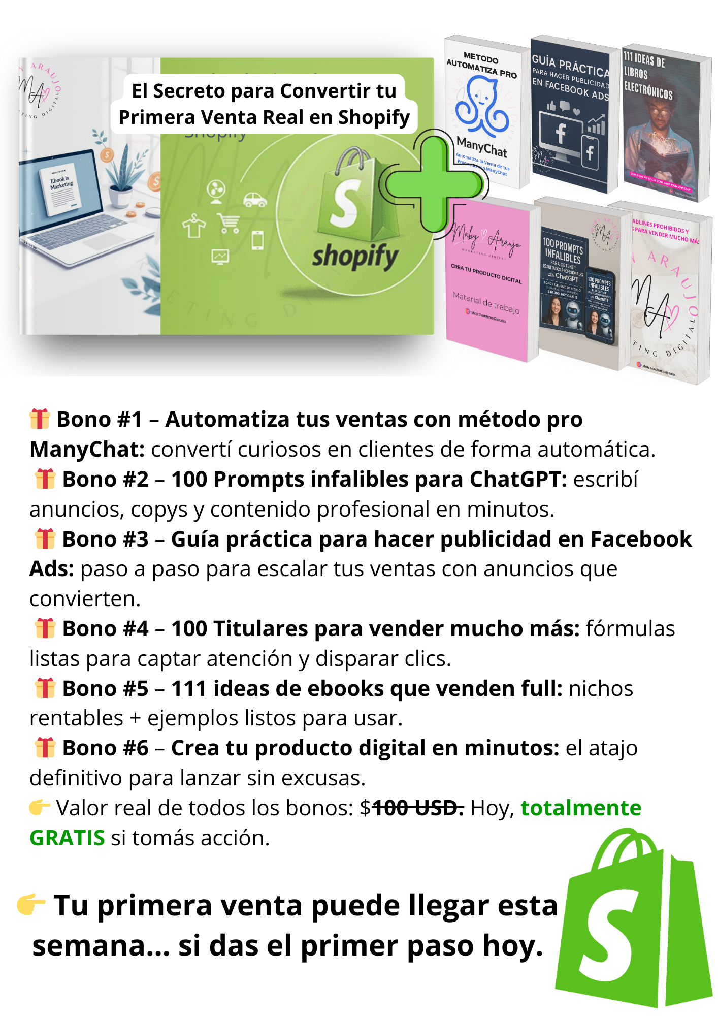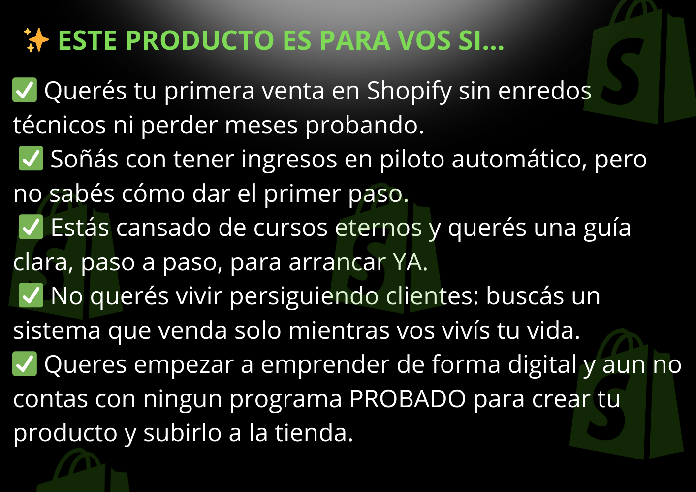 👉 No. Te enseño paso a paso desde cero cómo crear tu tienda, cargar tu producto digital y llegar a tu primera venta sin conocimientos técnicos previos.