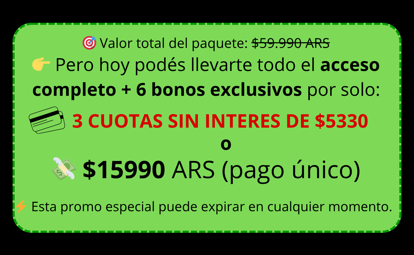 👉 Depende de tu compromiso, pero muchos alumnos logran su primera venta en menos de 7 días aplicando el método y usando los bonos incluidos.